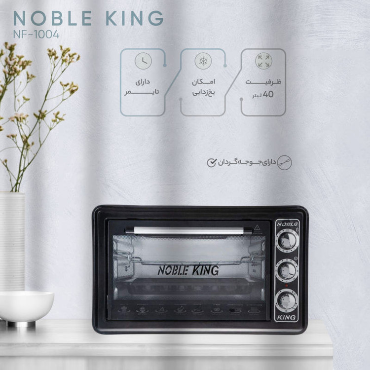 آون توستر «نوبل کینگ» مدل «NF-1004» با گنجایش زیادی که دارد میتواند غذاهای زیادی را آماده کند. باقدرت بالایی که مدل NF-1004 دارد حرارت داخل آون را تا حدی بالا میبرد که حتی میتواند گوشت را کباب کند. ظرفیت 40 لیتری این آون توستر امکان قرار دادن غذا با حجم بالا را نیز ممکن میسازد و بهراحتی میتوان از جوجهگردان استفاده کرد تا مرغ بریان شده را برای وعدههای غذایی آماده کرد. حداکثر دمای ایجادشده توسط این دستگاه 320 درجه سانتی گراد است. استفاده از سینی قابل جدا شدن امکان گریل کردن را هم میدهد. این دستگاه دارای تایمر است تا احیاناً در صورت فراموشی غذا نسوزد همچنین تایمر دستگاه تا 90 دقیقه قابلیت دارد. ضمناً در پایان زمان تعیینشده با یک زنگ، خاتمه پخت اعلام میشود. از دیگر ویژگی ها می توان به سیستم محافظ برق، شیشه دو جداره، بدنه داخلی نچسب، جوجه گردان، سيني غذا و توري گريل اشاره کرد اين آون توستر قابليت تنظيم روشن شدن گريل بالا، پايين يا گريل بالا و پايين به صورت هم زمان را دارد. همچنین کیفیت ساخت بالای محصول تولیدی این شرکت، برای تمام کاربران، بیشازپیش، تضمینشده است.