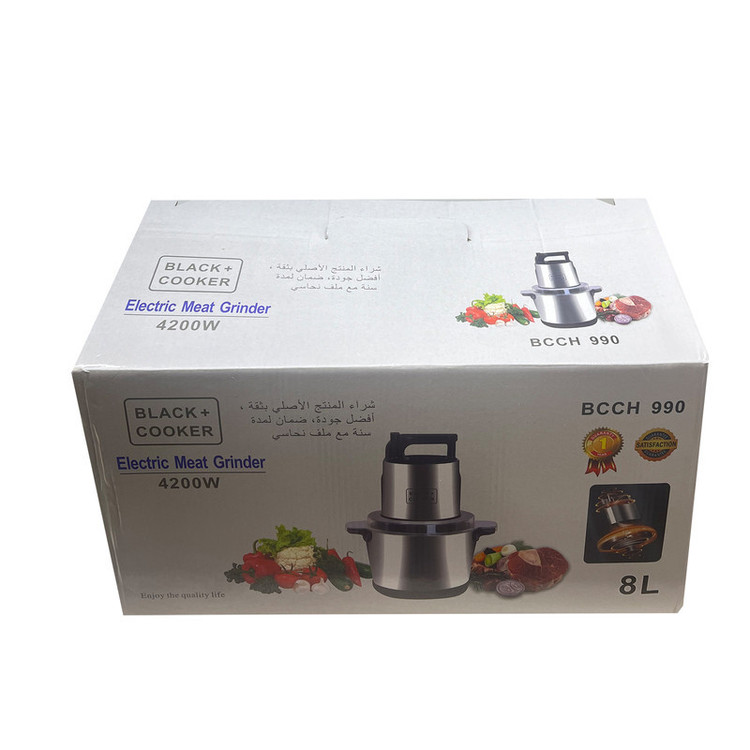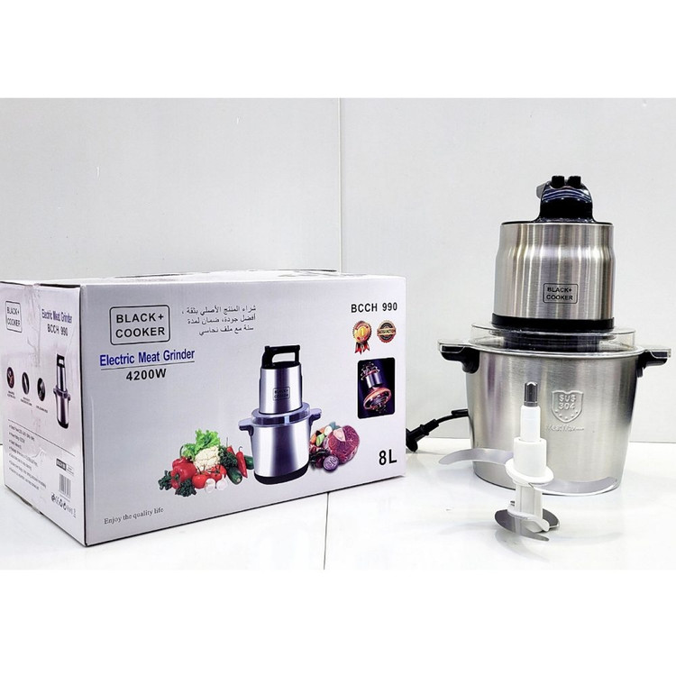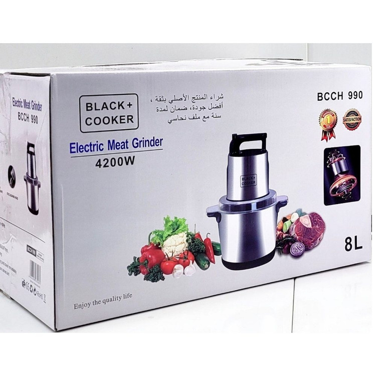شرکت بلک کوکر یکی از تولید کننده های مطرح لوازم خانگی برقی در دنیا می باشد که محصولات خود را تحت لیسانس آلمان و در چین با بالاترین کیفیت و طراحی بروز دنیا مونتاژ می کند .مخزن خردکن 8 لیتر و با توان مصرفی 4200 وات قویترین موتور برای یک خردکن می باشد و از دیگر خصوصیات این محصول شفت فلزی و فیوز حرارتی که در زمان استفاده بیش از حد و داغ شدن سیم پیچ موتور بصورت خودکار خاموش شده و از آسیب رسیدن به سیم پیچ جلوگیری می کندو تا زمان خنک شدن دستگاه خاموش می ماند.این امر تظمین کننده ی طول عمر دستگاه می باشد. از این محصول می توان برای پوره کردن گوشت سبزیجات میوه جات و غیره استفاده کرد