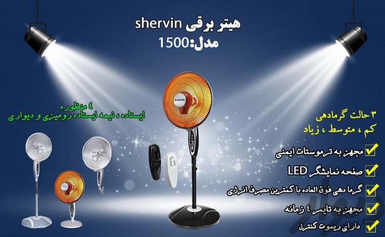 استفاده از هیتربه جای بخاری ر روزهای نهچندان سرد یکی از رویههای اقتصادی و راحتتر برای ایجاد گرما در محیط است چرا که شما را با مسائلی مانند سرویس کردن دورهای و مواردی از این دست درگیر نمیکند. در این میان گزینههایی با قابلیت قرارگیری به شکل ایستاده از اقبال بیشتری برای فروش برخوردار هستند، چرا که علاوه بر ظاهر زیبایی که دارند فضای کمی را هم اشغال میکنند. هیتر شروین محصولی مجهز به کنترل از راه دور و تایمر 7.5 ساعته است که میتوان آن را در چهار حالت ایستاده، نیمه ایستاده، رومیزی و دیواری تنظیم کرد. موتور سوار شده بر روی این دستگاه از نوع AEG اصلی است و با توجه به قدرت و مصرف کم انرژیای که دارد میتوان حجم باددهیای به اندازهی 65 متر مکعب در دقیقه را ایجاد کند. از دیگر مشخصههای این کالا بهرهمندی از قابلیت تنظیم ارتفاع و سرعت در سه حالت است.لازم به ذکر است که این کالا به صورت غیر مونتاژ و جدا جدا ارسال میشود و نیاز است که مشتری خود آن را نصب و راهاندازی کند.